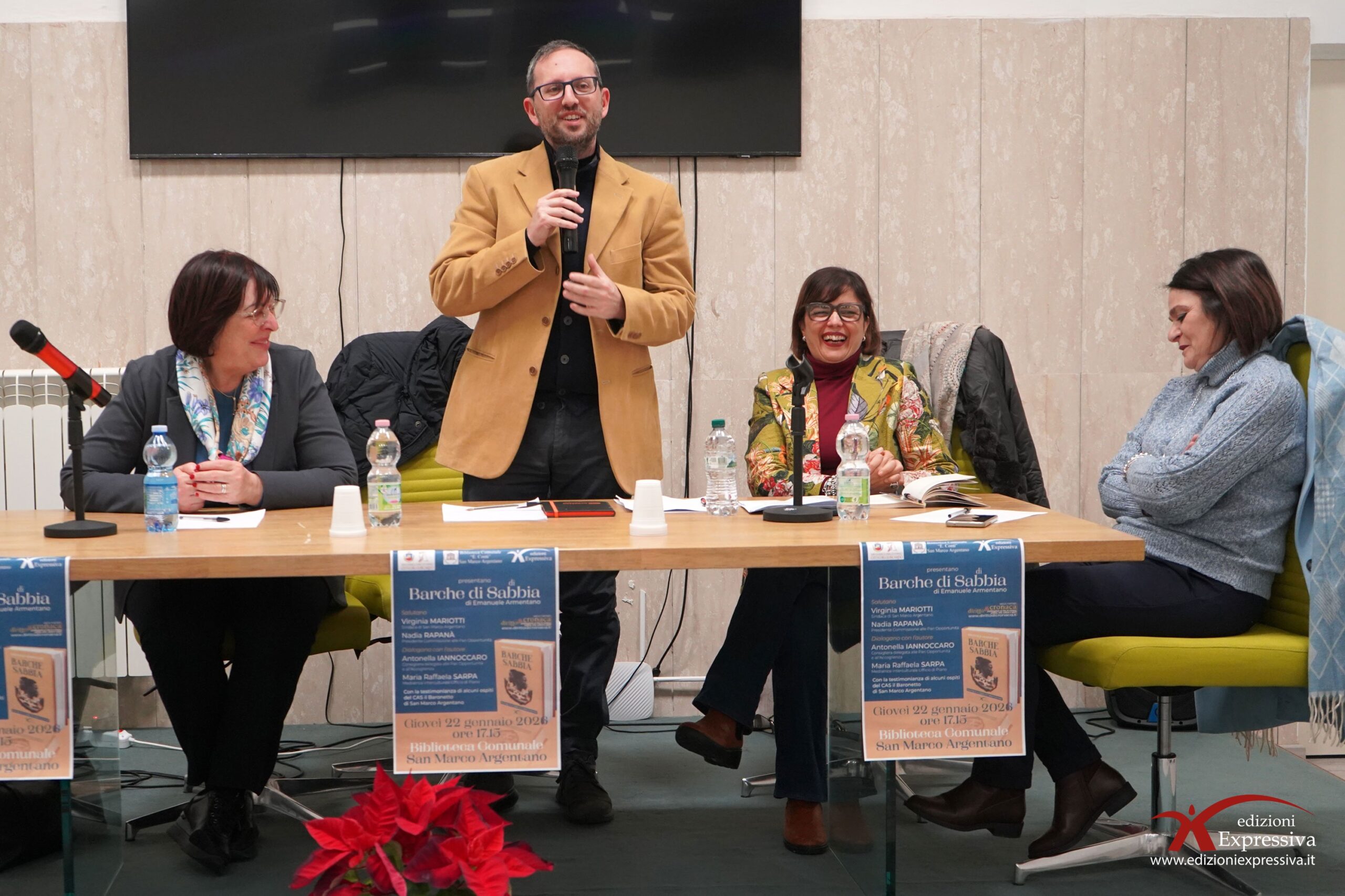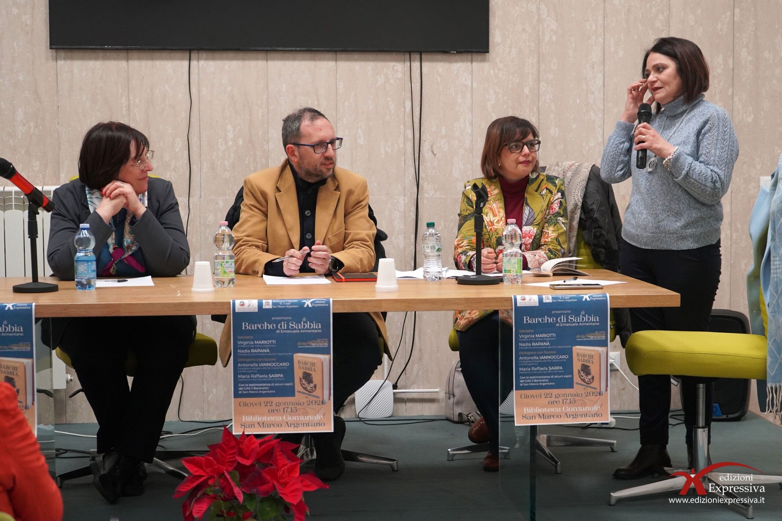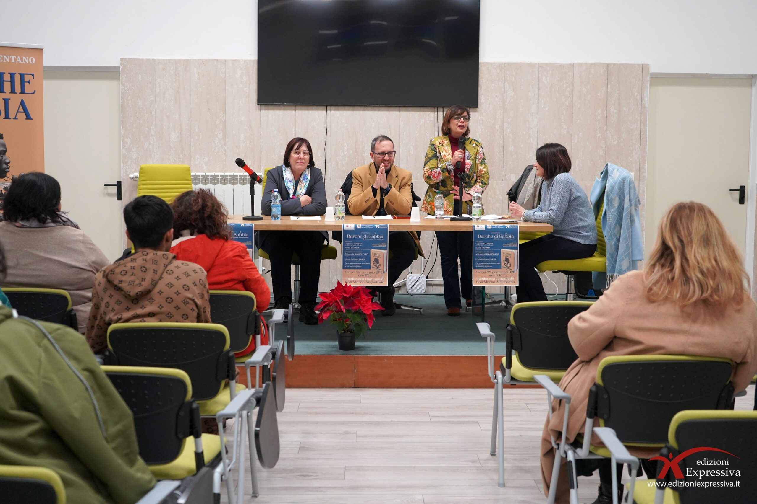 Nel pomeriggio di ieri, giovedì 22 gennaio, la Biblioteca Comunale di San Marco Argentano ha ospitato la presentazione del libro “Barche di Sabbia” di Emanuele Armentano. Un evento riuscito, con una buona partecipazione di persone attente che hanno seguito fino alla fine le riflessioni sui temi del reportage. Molto toccanti le testimonianze degli ospiti del CAS Il Baronetto. Con il loro intervento, hanno ribadito le difficoltà che gli immigrati incontrano al loro arrivo in Europa. La storia dei due protagonisti, Abu e Susso, continua a farsi strada e a lasciare un segno nel cuore del pubblico, che con emozione ed empatia ascolta, dialoga e riflette. Il reportage si conferma così un atto di sensibilizzazione, con l’obiettivo ormai storico di guardare chi arriva da lontano con occhi gentili.